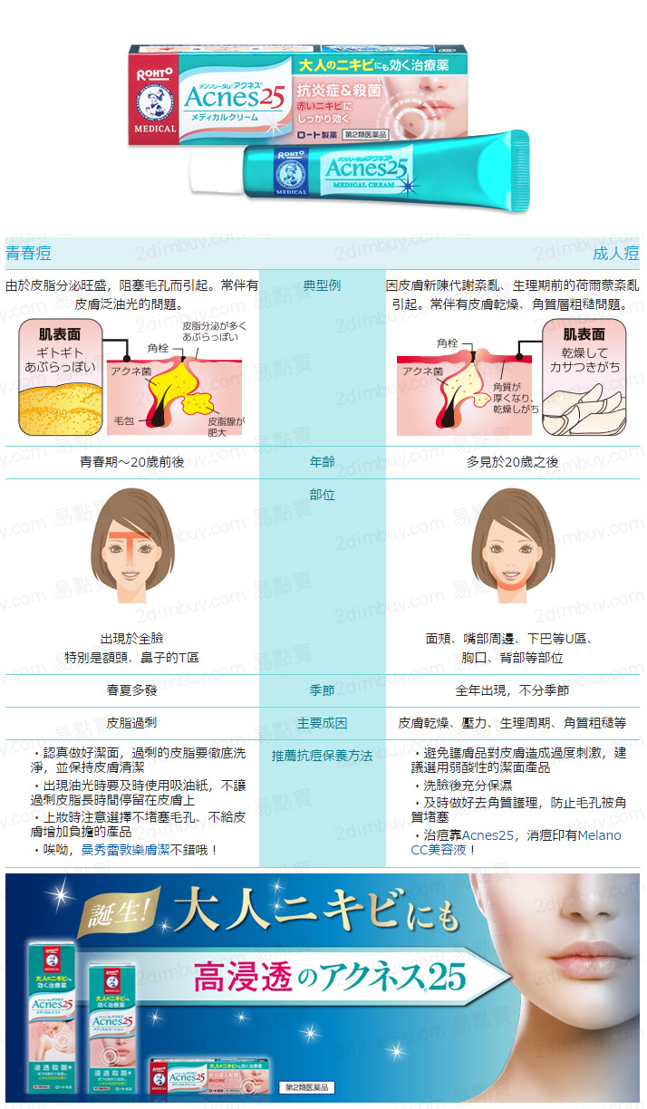 功效跟獅王 PAIR ACNE 暗瘡膏相約,但曼秀雷敦 Acnes25 成人藥用暗瘡膏主要針對頑固成人暗瘡和壓力瘡,主要出現於面頰、嘴部周邊、下巴等U區、胸口、背部等部位。 因皮膚新陳代謝紊亂、生理期前的荷爾蒙紊亂, 角質粗糙等引起。